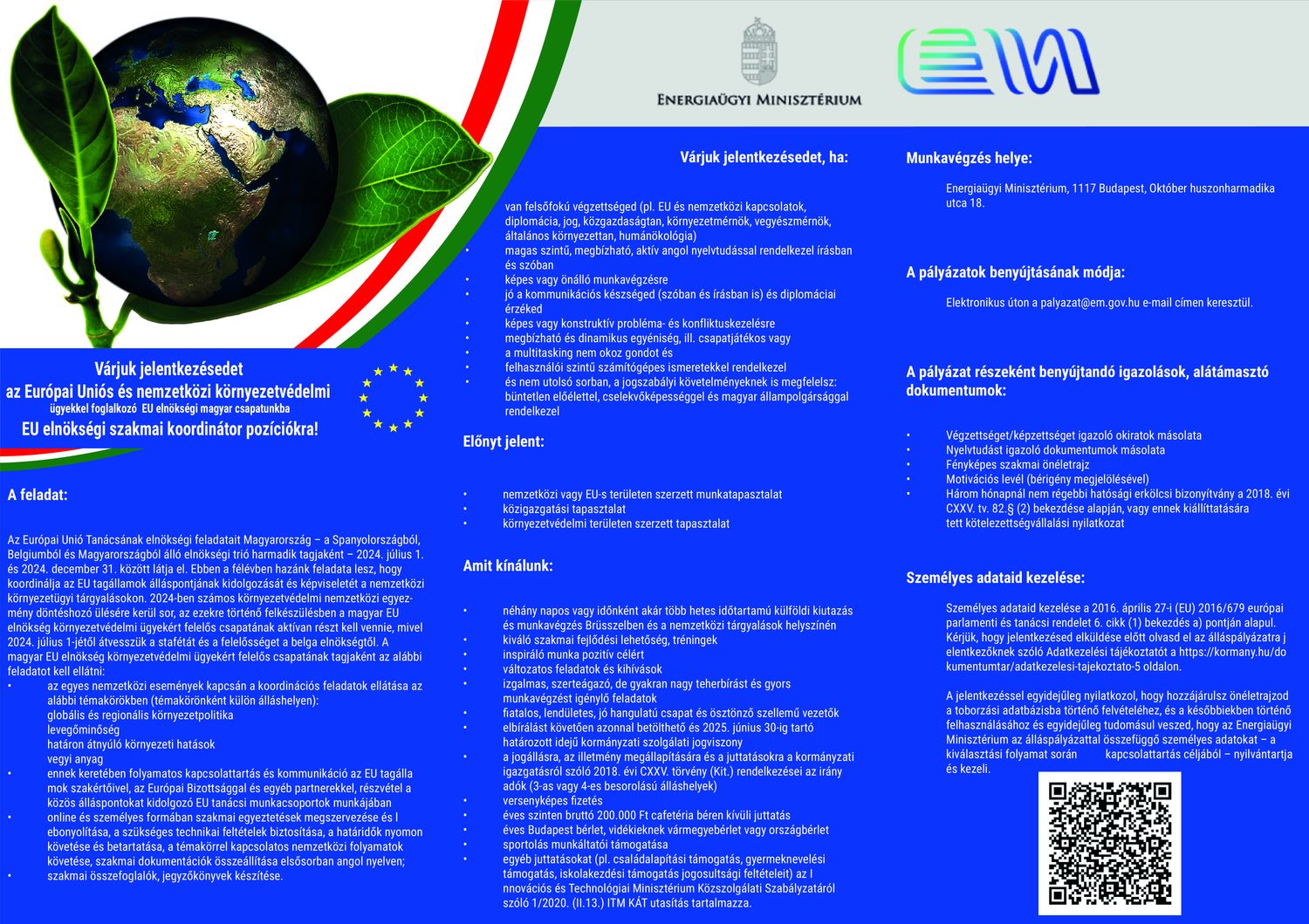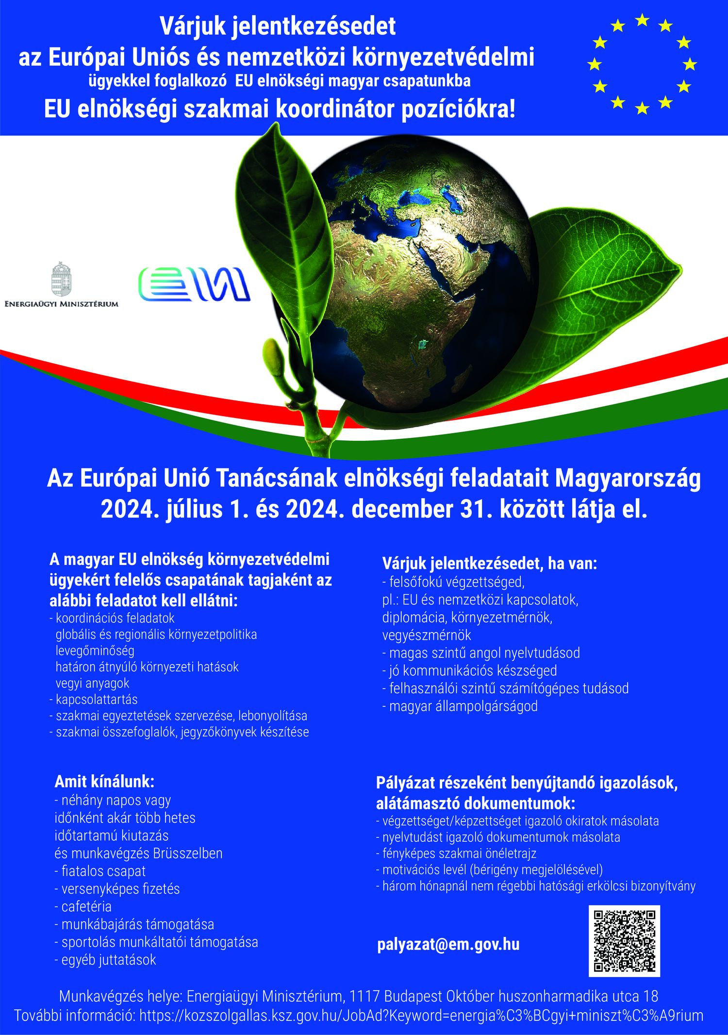 Az Energiaügyi Minisztérium, mint a környezetvédelemért felelős szaktárca az elnökségi feladatai ellátására, valamint az ahhoz szorosan kapcsolódó előkészítő és utómunkák ellátására EU elnökségi szakmai koordinátor pozícióra műszaki-, jogi- vagy közigazgatási szakterületi végzettségű munkatársakat keres.